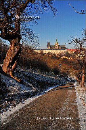 Cesta v Petřínských sadech na pozadí Hradčan, Praha.