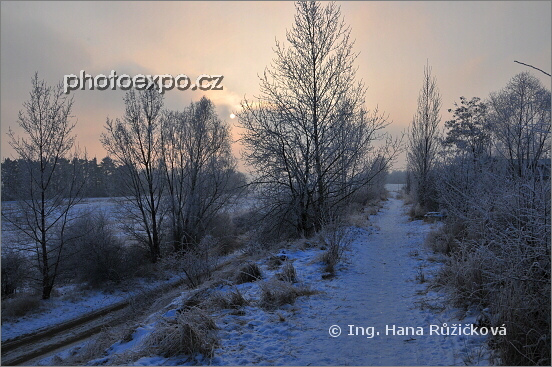Mrazivá příroda a slunce klonící se k západu, Praha.