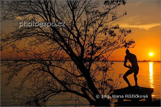 Západ slunce z indiánské vesnice Guamá u laguny del Tesoro. Vesnice dávných obyvatel Taínů zde byla rekonstruovaná do podoby indiánského skanzenu. Sochy indiánů vytvořila kubánská sochařka Rita Longaová. Oblast Zapata, Kuba.