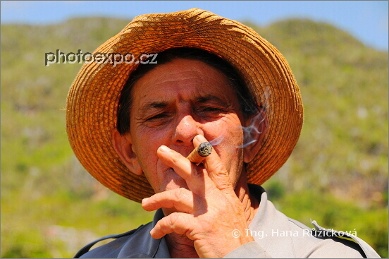 Otec Benita, vinaleskeho rančera a pěstitele tabáku, vychutnávající si čerstvě ubalený doutník. Kuba.