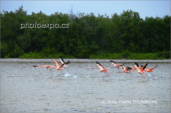 Plameňáci v rozběhu po vodní hladině. Ptačí oblast Laguny de las Salinas. Oblast Zapata, Kuba.