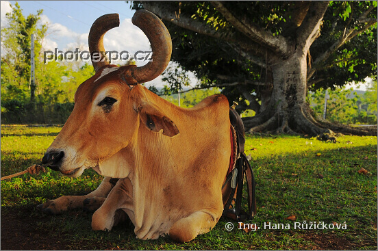 Oběť turistů s upilovanými rohy pro bezpečnost čeká ve stínu obrovských fíkusů na svého chlebodárce, který by zaplatil za svezení. Oblast Viñales, Kuba.