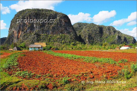 Zemědělská pole a mogoty - zvláštní kopce, které jsou vlastně skalními krasovými útvary vzniklými před cca 100 miliony let, kdy se v období křídy celá tato oblast podemílaná podzemní vodou propadla a zůstaly stát pouze erodované stěny. Na stráních těchto mogot lze pozorovat krápníky a další krasové útvary. Oblast Vinales, Kuba.