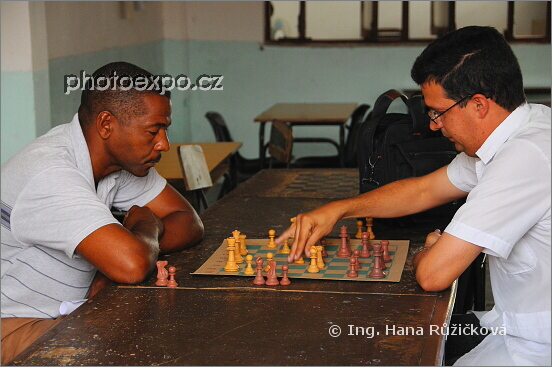 V zápalu hry... Průhledem do místnosti, kde zrovna probíhal u několika stolů šachový turnaj. Pinar del Río, Kuba.
