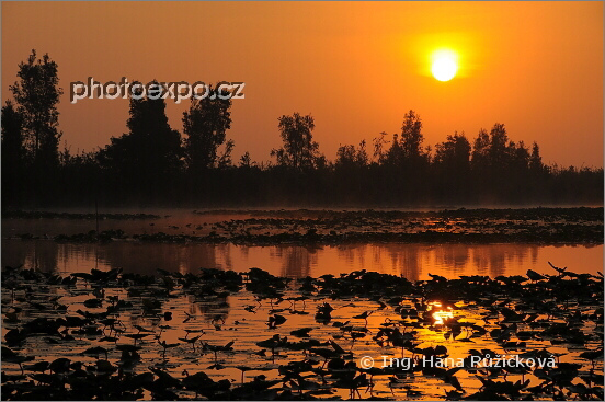 Sytě oranžový východ slunce nad Lagunou del Tesoro a stovkami listů leknínů a dalších vodních rostlin. Zapata, Kuba.