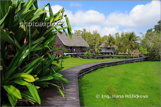 Dřevěné chodníčky a vodní bungalovy v areálu Villa Guamá na Laguně del Tesoro. Zapata, Kuba.