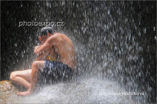 Třetí fotografie ze série čtyř snímků zamilovaného páru pod vodopádem Salto del Arco Iris nedaleko Soroy. Dvojice sedí stále na jednom místě, ale vodopád se horizontálně posunuje zprava doleva... Kuba