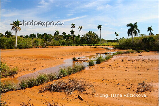 Sytě oranžová půda, potok a palmy v oblasti mezi Santa Lucia a Vinales. Kuba