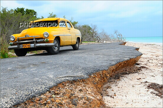 "Žlutý americký parking" na nezpevněném konci silnice u pláže na ostrově Cayo Jutías. Kuba