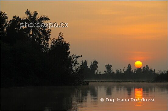 Nad Lagunou del Tesoro se vznáší jemný opar a první sluneční paprsky oranžově ozařují vodní hladinu, palmy a ptáky probouzející se v korunách stromů. A my si to vše užíváme na lodičce. Zapata, Kuba.