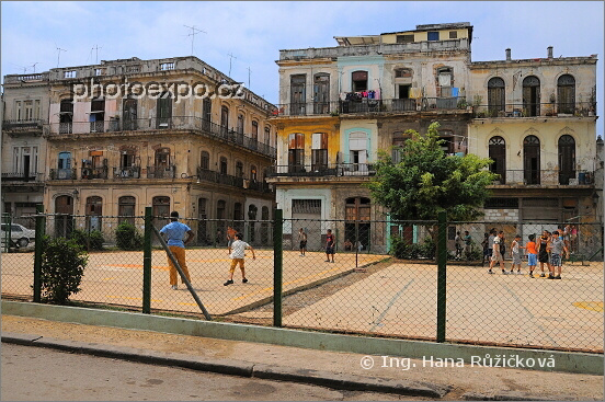 Dětská hřiště a oprýskané koloniální domy ve čtvrti Havana Vieja. Kuba