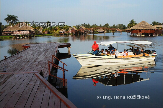 Člun přivážející turisty na prohlídku resortu Villa Guamá na Laguně del Tesoro. Zapata, Kuba.