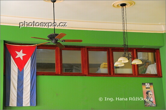 Součástí půvabného a rozlehlého interiéru restaurace La Lluvia de Oro je i zdánlivě nenápadné široké okno těsně pod stropem, zdobené kubánskou vlajkou a portrétem "milovaného" vůdce. A k čemu že to okno slouží? No přeci ke šmírování..."odpovědná" osoba průběžně kontroluje, zda se dole v restauraci něpáchají nějaké nepravosti, které potřebují "nápravu". Havana, Kuba.