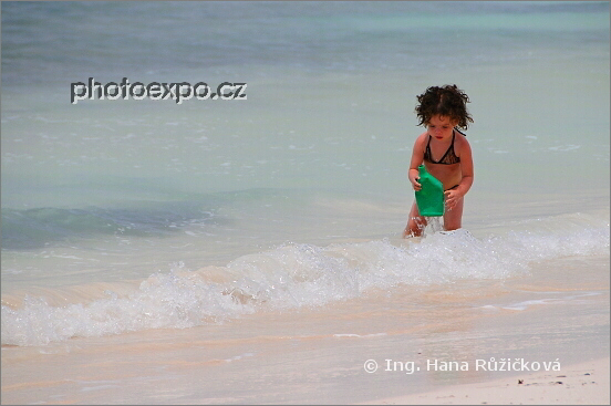 Pozor ať tě ta vlna nesmete! Malá holčička v pobřežních vodách Atlantiku na Cayo Jutías. Kuba