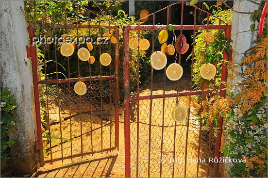 Tak schválně hádejte, kam tato branka dekorovaná nakrájeným ovocem vede... Do domácké soukromé a velmi rozlehlé botanické zahrady El Jardín de Caridad v městečku Vinales. Kuba