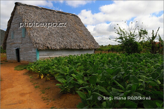 Tabáková plantáž u tzv. secadera - sušírny tabákových listů. Od zasetí tabákového semena do sklizně dospělé tabákové rostliny to trvá cca 4 měsíce. Existují dvě základní odrůdy tabákových rostlin: Corojo, šlechtěný ve sklenících a poskytující nádherné listy používané jako krycí listy doutníků a Criollo, pěstovaný na polích pod širým nebem, jehož listy se "kouří". Oblast Vinales, Kuba.