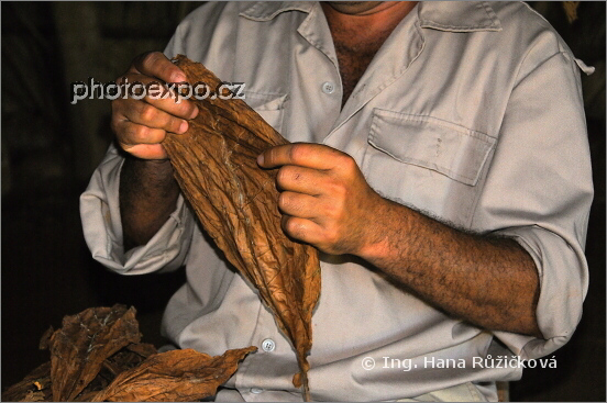 V páté fázi výroby doutníku si Benito připravuje tzv. capu, krycí tabákový list, který vytvoří povrch doutníku a propujčí mu hladký, sametový vzhled i barvu. Vinales, Kuba.