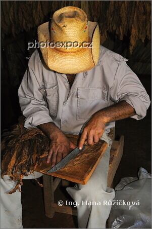 V šesté fázi výroby doutníku Benito seřezává krycí list capa nožem (v doutníkových továrnách používají nůž zvaný chaveta) do požadovaného tvaru, vhodného pro finální zabalení doutníku. Vinales, Kuba.