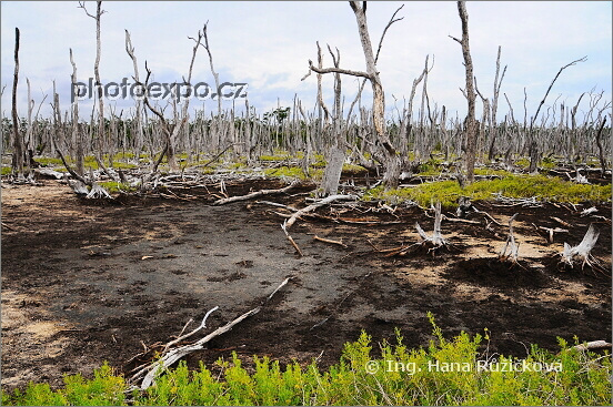 Torzo lesa na břehu ostrova Cayo Jutías zbylé po řádění hurikánu. Kuba