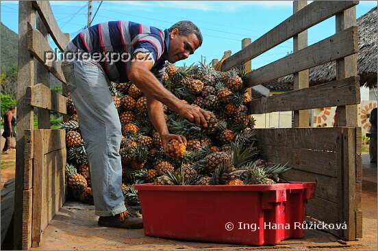 Vykládání šťavnatých ananasů z vozu připojeného za traktor v tržnici ve Vinales. Ačkoli bychom mohli očekávat, že kubánské obchody a tržnice budou hýřit exotickým ovocem a různými druhy zeleniny, opak je pravdou. Když už turista narazí na místo, kde se prodává něco ze "sekce zelenina a ovoce", bývají právě ananasy tím nejlepším a nejlákavějším zbožím. Svým fotoaparátem jsem u skládání ananasů "otravovala" tak dlouho, že jsem nakonec od tohoto muže vyfasovala jeden úžasně šťavnatý plod zdarma. Kuba