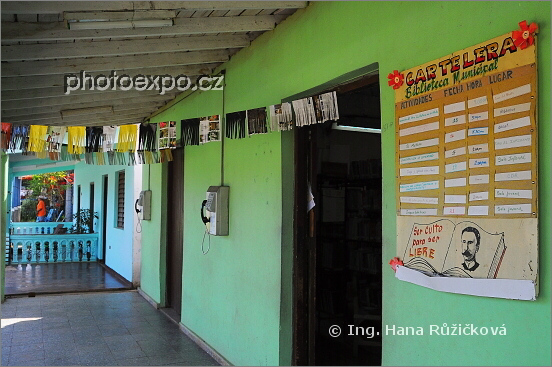 Svérázný vstup do místní knihovny umístěné v podloubí hlavní třídy městečka Vinales. Vpravo je ručně popsaná vývěska s přehledem aktivit konaných v knihovně. Ke vstupu pak lákají na třásně rozstříhané stránky časopisů a knih zavěšené na šňůrách v podloubí. Kuba