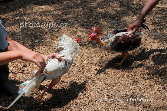 Druhá ze tří fotografií kohoutího zápasu. Bojoví kohouti s oškubanýma nohama a zadkem výhružně načepýřili svá pera za krky a vrhají se po sobě. Pinar del Río, Kuba.