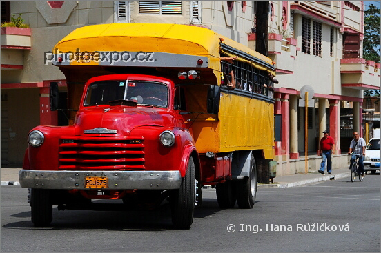 Náklaďákový autobus narvaný místními pasažéry v Pinar del Río, Kuba.