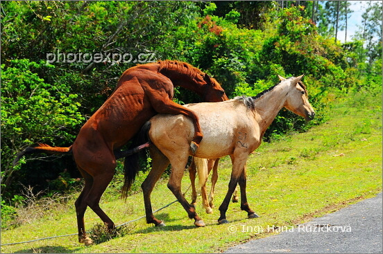 Nadrženého hřebce s jeho vyhlédnutou klisnou jsme objevili na silnici směrem na Valle Ancón. Nedalo nám to, zastavili jsme a fotografovali. Vtom se přihnal místní mladík a asi abychom neutrpěli mravní újmu, hřebce odehnal od jeho vytoužené a oba zahnal dál od silnice. Z toho leknutí ... no prostě ... záhy byl hřebec indisponován. Tak jsme opět nasedli do auta a pokračovali :=) Kuba