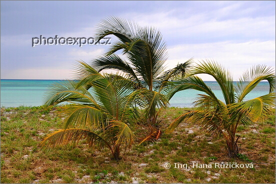 Magická podmračená atmosféra ostrova Cayo Jutías s palmami ve větru. Kuba
