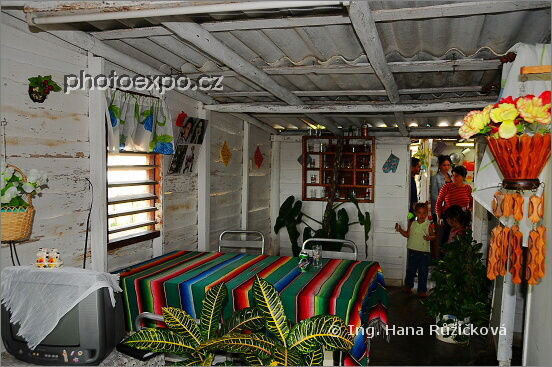Tak tenhle domek mě nadchnul! Na snímku je interiér průchozího obývacího pokoje tohoto domku, kde jsme po dvě noci bydleli načerno, tedy v nelegální "casa particulares" (legální tu žádné nebyly) u Playa Bailén. Dům byl stlučen z prken, mezi kterými notně profukovalo škvírami, jež zároveň nechtěně poskytovaly i dostatek světla a významně tak sekundovaly oknům či spíše dírám vyplněným dřevěnými - a pokud fungovaly - nakláněcími žaluziemi. Střechu domu tvořily palmové listy položené na dřevěné kostře a celý prostor domu byl rozdělen na dvě ložnice, příslušenství (pokud umyvadlo, ze kterého většinou nic neteklo, zrezivělou hlavu sprchy na dlouhé zrezivělé tyči s jednou pákou, ze které také většinou nic neteklo a špinavou keramickou záchodovu mísu, která většinou nesplachovala, lze takto luxusně označit) a tento průchozí obývak a to tenkými příčkami dosahujícími asi tak do poloviny výšky domu. Prostor nad "luxusní částí obýváku" byl navíc ve výšce konců příček překryt vlnitým plechem. Platili jsme 20 CUC, tedy necelých 400 Kč za noc pro dohromady 4 osoby :=) No neber to! ...A ta "domácí" atmosféra. Jen majitelé se chudáci na ty dvě noci museli vystěhovat a spát na dvorku. Prostě fascinující Kuba!