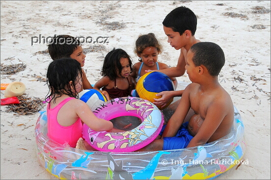 Když jsem na tento bazének namířila svůj fotoaparát, byly v něm pouze dvě nejmenší holčičky. Jakmile si děti v okolí všimly mého fotografického zájmu, už se nacpaly do bazénku v počtu, v jakém to jen šlo. Perličkou je, že tento nafukovací bazének byl umístěn na pláži ostrova Cayo Jutías, od moře vzdálen tak 3 m. Kuba