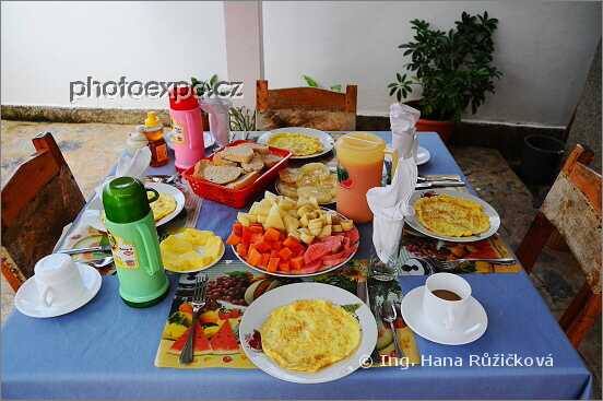 Jedna z typických snídaní v casa particulares: Ostatně stravovali jsme se téměř výhradně v casa particulares, jinak bychom asi umřeli hlady. Nalézt na Kubě, vyjma těch naprosto největších měst, nějaký obchod s potravinami, kde by toto zboží bylo i reálně, se nám opravdu nedařilo. A co tedy bylo k snídani? No, vždy to stejné. Vaječná omeleta (převajíčkováno na několik měsíců), typické ovoce, tedy ananas, papaya a guava (kvajava), kterou jsem ochutnala jen jednou, nebotˇ jsem během sekundy skončila na záchodě (chutí totiž tuto místnost připomínala). K tomu občas med, občas marmeláda. Samozřejmě pečivo. Vždy káva, většinou i nějaký džus. A nádherně prostřeno! Casa El Cuba Libre, Vinales, Kuba.