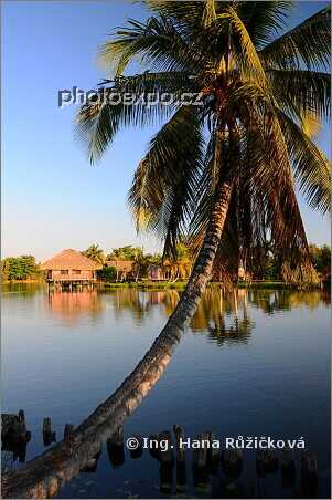 Palma a vodní bungalovy komplexu Villa Guamá nad Lagunou del Tesoro. Zapata, Kuba.