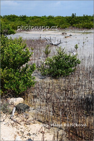Laguna de las Salinas s detaily vodních rostlin včetně mangrovů. Zapata, Kuba