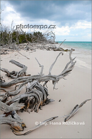 Pahýly pobřežní flory na Cayo Jutías, zdecimované pravděpodobně hurikánem. Přikryté brouřkově zamračenou oblohou vytvářely magickou atmosféru. Kuba