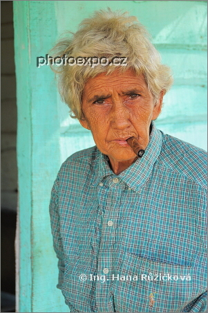 Na Kubě doutník rozhodně není pouze mužskou záležitostí, zde kouří téměř všichni. I tato postarší dáma, matka Pedra, který nás pozval k sobě do skrovného domku a každému nám ubalil jeden doutník. Oblast Vinales, Kuba.
