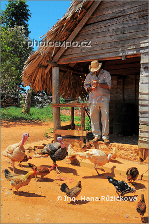Pedro krmí svou pestrou drůbež. Oblast Vinales, Kuba.