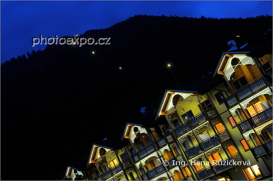 Noční detail hotelu Weisenhof **** výhledem z mého balkonu v protilehlém hotelu Caroline****. Nad hotelem svítí lanovka vedoucí na vrchol Zwölferkopf (1500 m). Pertisau u Achensee, Rakousko.