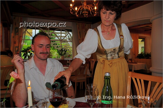 Servis u večeře v hotelu Caroline**** byl opravdu profesionální. Obsluha navíc chodila v typických místních krojích, jiných při snídani, jiných při večeři. Tato dáma ač již mnoho let v Rakousku, je rodilá Chorvatka a na nás Čechy reagovala velmi pozitivně :=) Chvala... Pertisau, Rakousko.