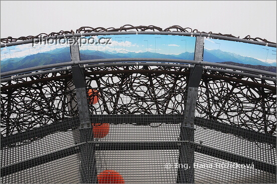 Detail kovové vyhlídkové plošiny Aussichtsplattform na vrcholu Gschöllkopf (2039 m n.m.) v Tyrolských Alpách. Kolem plošiny jsou instalované fotografie vrcholů a jejich popisů, které má být z vyhlídky vidět a to v rozsahu 360 stupňů. Nám nezbývalo než si je představovat... Rakousko