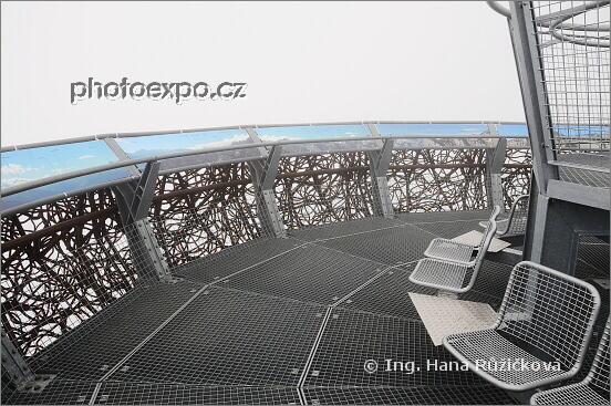 Další detail vyhlídkové plošiny Aussichtsplattform na vrcholu Gschöllkopf (2039 m n.m.) v Tyrolských Alpách. Kovovou konstrukci lemuje pás fotografií s popsanými vrcholy, které má být z plošiny vidět (jsme slepí ... nebo...?) a také kovová sedátka pro odpočinek po náročném výstupu. Rakousko