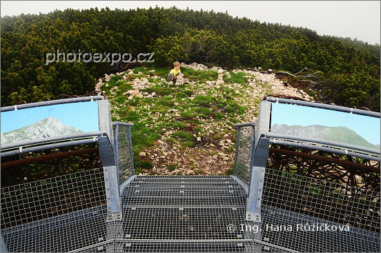 Kovová moderní 360-stupňová vyhlídková plošina Aussichtsplattform na vrcholu Gschöllkopf (2039 m n.m.) a malý kluk, který zjistil, že kvůli mlze nic neuvidí, tak se rozhodl postavit si Trolla pro štěstí. Tyrolské Alpy u Achensee, Rakousko.