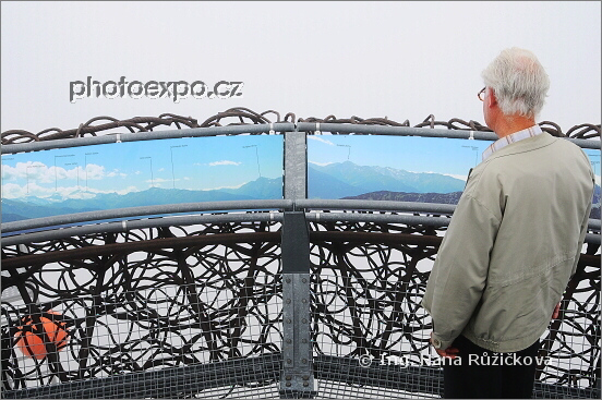 Kampak zmizely ty vrcholy...? Tak možná takhle dumal pán, který s námi vstoupal vzhůru na "kovové UFO". Díky husté mlze, jsme si na vyhlídkové plošině Aussichtsplattform na vrcholu Gschöllkopf (2039 m n.m.) mohli okolní vrcholy pouze představovat. Pomáhal nám v tom (ale zároveň i dráždil) pás fotografií popisující v rozsahu 360 stupňů jednotlivé horské velikány. Tyrolské Alpy, Rakousko.