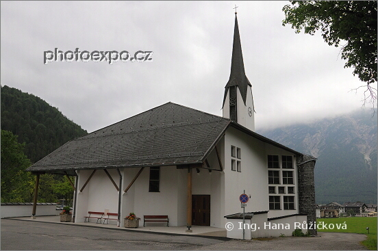 Evangelický kostel dominující městečku Pertisau na břehu jezera Achensee, Rakousko.