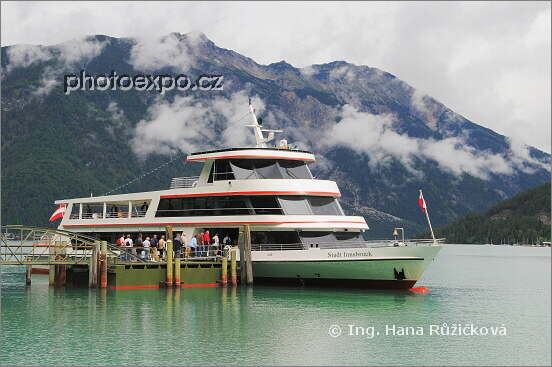 Moderní parník zajišťující dopravu na Achensee právě zastavil v přístavu Seespitz. Rakousko