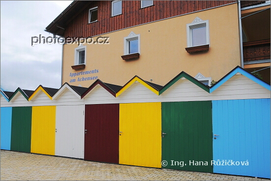 Barevné garáže u jednoho z domů v městečku Pertisau na břehu Achensee. Rakousko