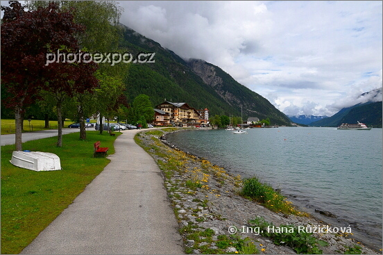 Nábřežní promenáda kolem jezera Achensee, po které jsme se projížděli na vozítkách Segway. Zde pohled směrem na městečko Pertisau. Rakousko