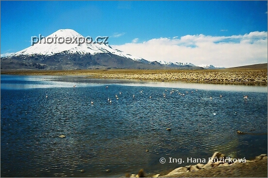 Úchvatný vulkán Parinacota (6342 m n.m.) a laguna Chungará v NP Lauca. Chile