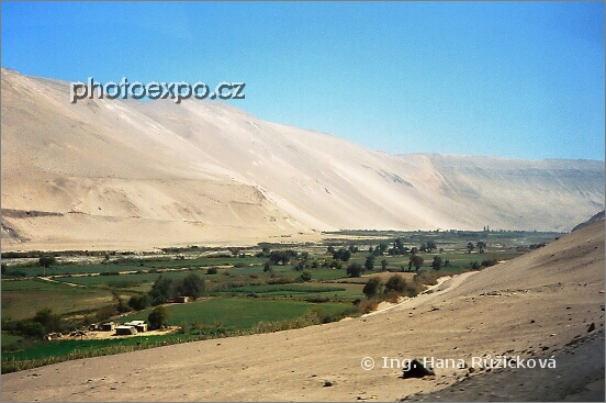 Zavlažované zelené údolí svírané vyprahlou náručí chilské pouště cestou z města Arica k bolívijským hranicím. Chile