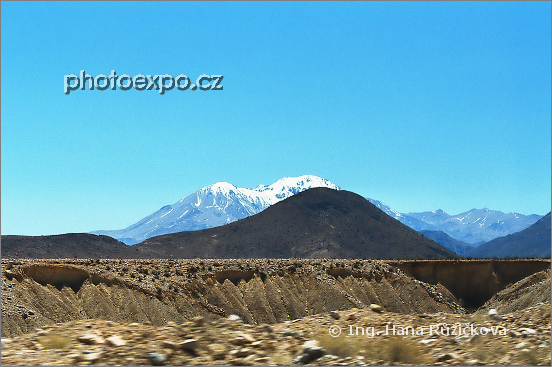 Vynořující se horské velikány NP Lauca na cestě mezi Aricou a chilsko-bolívijskou hranicí. Chile